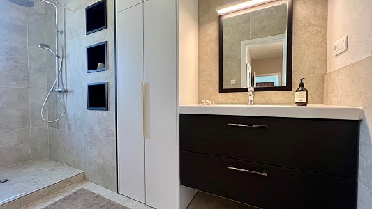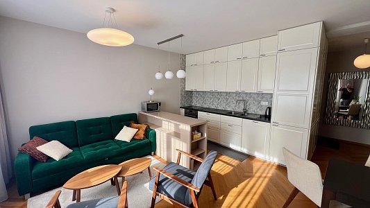 Dispozične byt pozostáva zo vstupnej haly, dvoch spálni, kúpeľne, samostatnej toalety, balkónu a obývačky spojenej s kuchyňou. V každej izbe sa nachádza klimatizačná jednotka. Byt disponuje vlastným kotlom na kúrenie a ohrev vody. V byte je podlahové kúrenie. Vstupná hala je priestranná a je vybavená úložným systémom na mieru, ktorý plynule prechádza do denného priestoru obývacej časti bytu. Hlavná spálňa disponuje veľkou posteľou s úložným priestorom, veľkou vstavanou skriňou, komodou a nočnými stolíkmi. Menšia spálňa má rozkladaciu posteľ, komodu a písací stôl. Odtiaľto je vstup na balkón s výhľadom od Kamenného námestia až po Kamzík. V cene je k dispozícii aj pivničná kobka. Kúpeľna disponuje walk-in sprchovým kútom, umývadlom, radiátorom a skriňou na mieru, ktorá ukrýva práčku a sušičku.