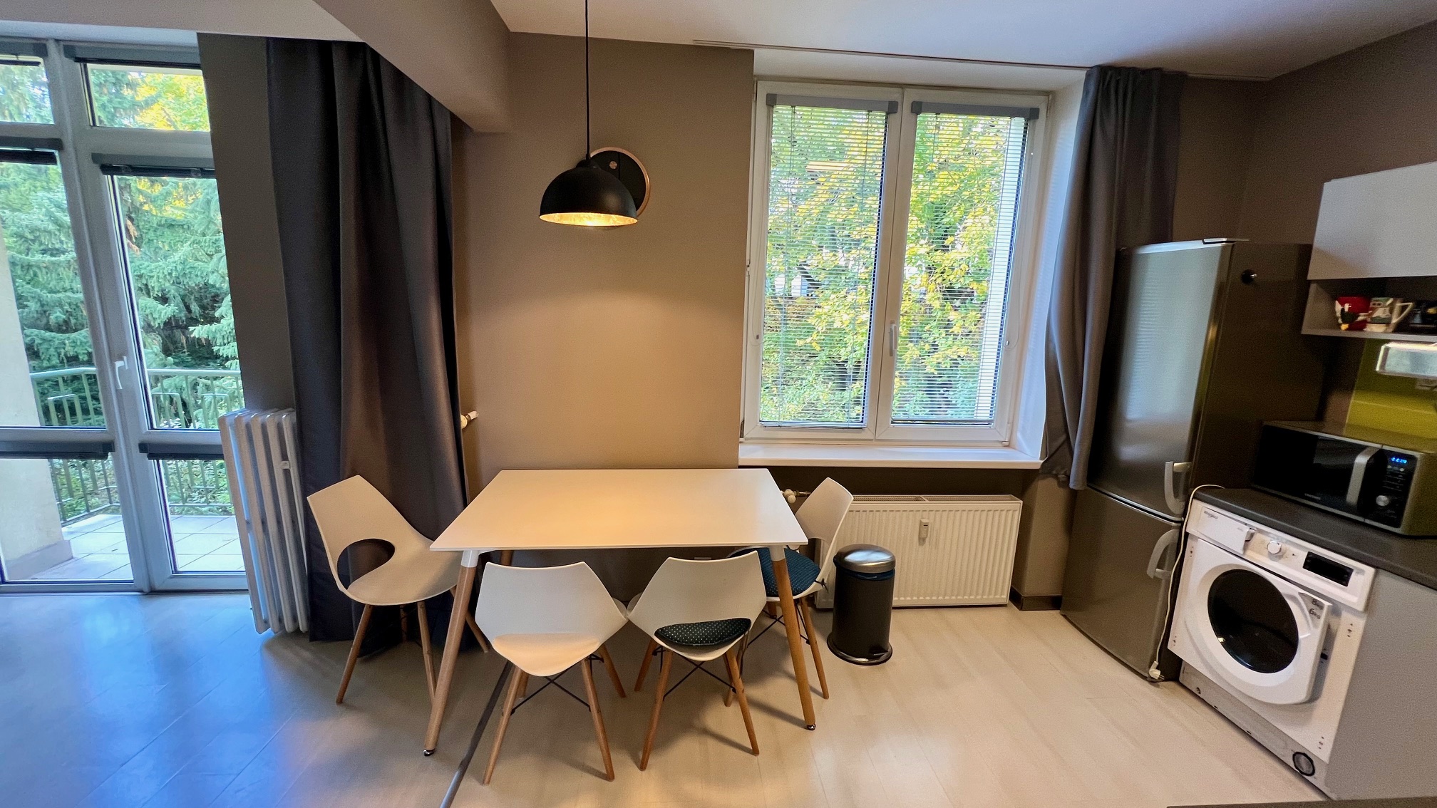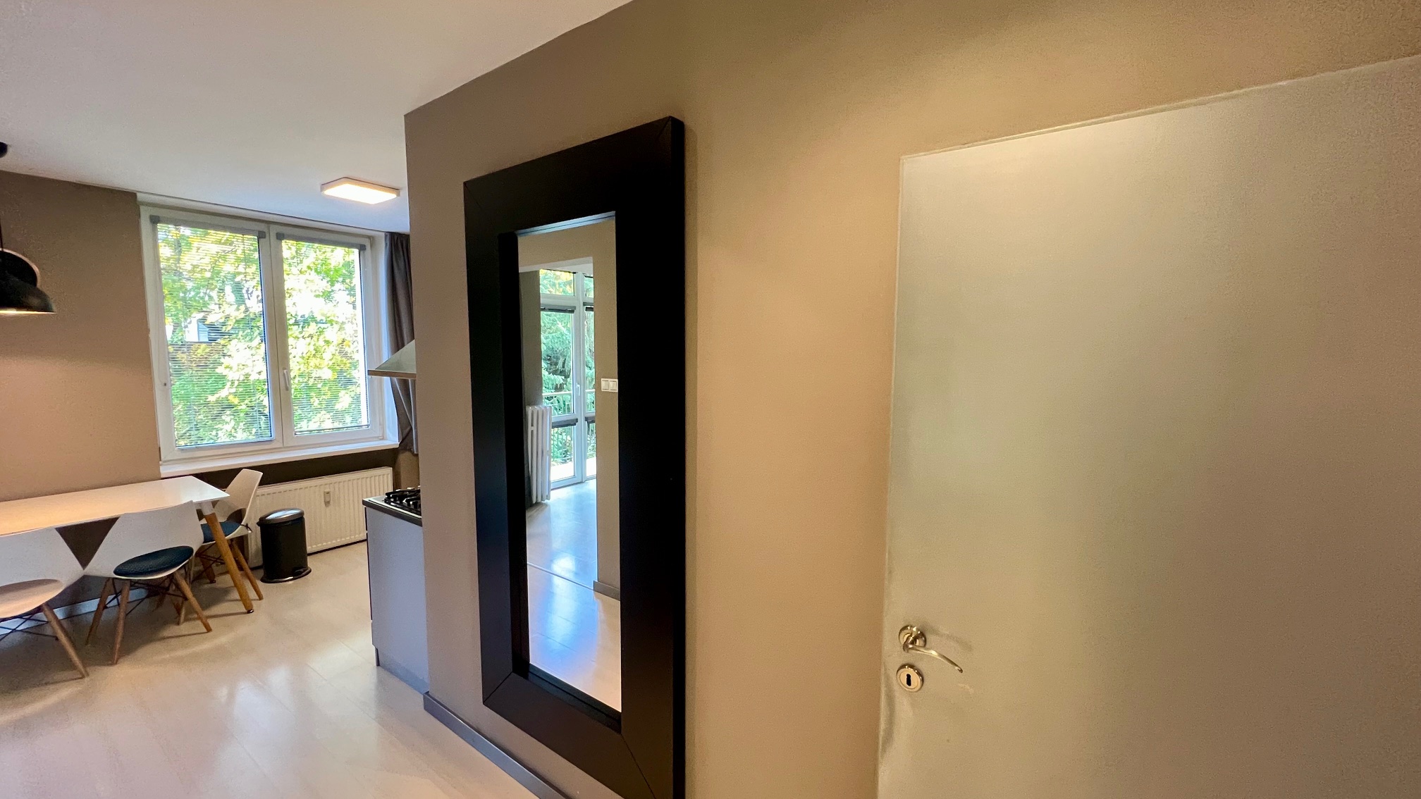 Byt má dve izby, pričom obývacia izba je spojená s kuchynskou časťou. Kúpeľňa je spojená s WC. Vybavenie kuchyne: kuchynská linka, plynová varná doska, chladnička s mrazničkou, mikrovlnka, teplovzdušná rúra a digestor.